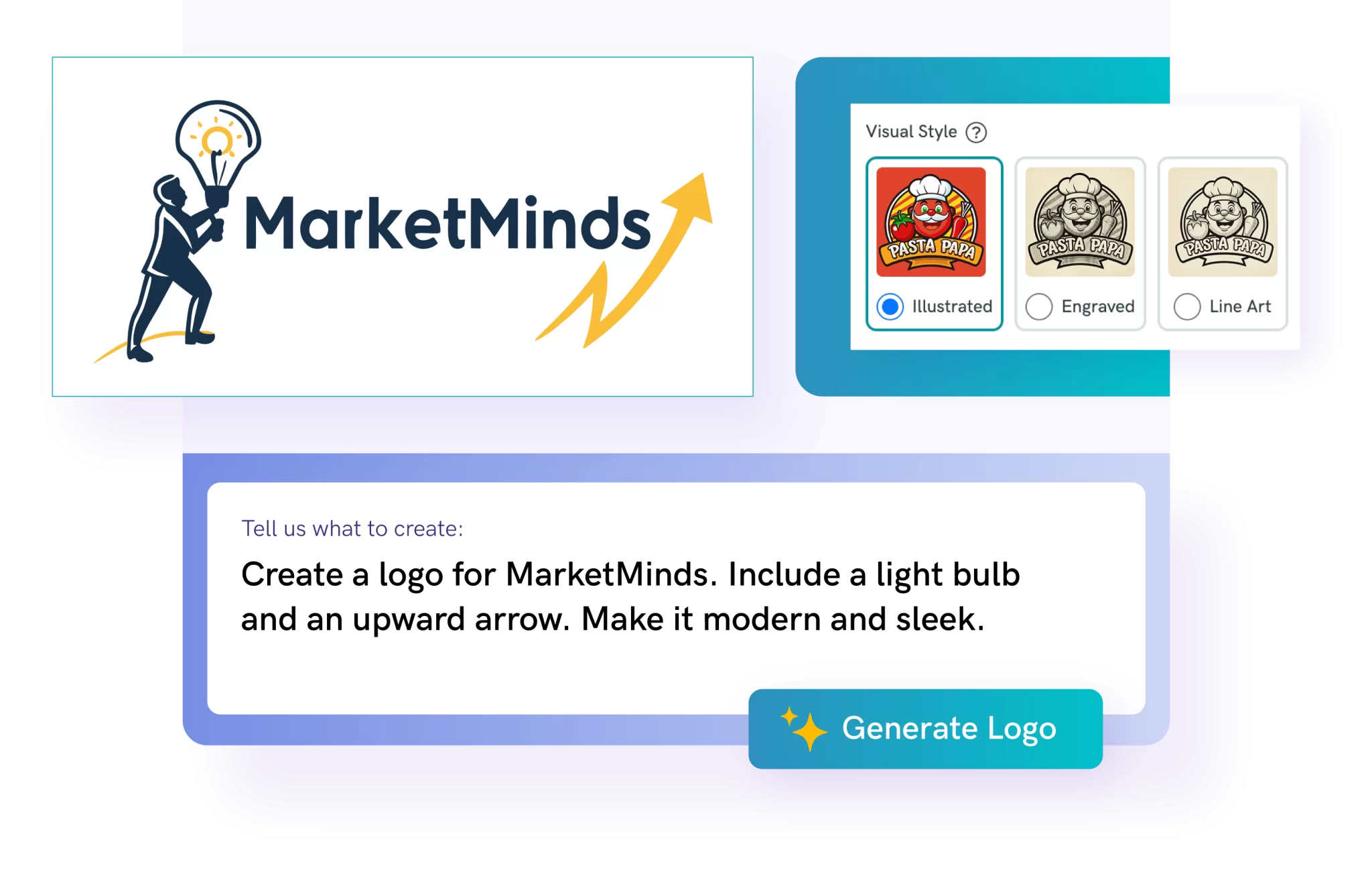 Move beyond the basics. Just by asking our AI to refine the style, you can have a logo in engraved style for timeless authority, line art for modern minimalism, or illustrated for a vibrant, custom feel.