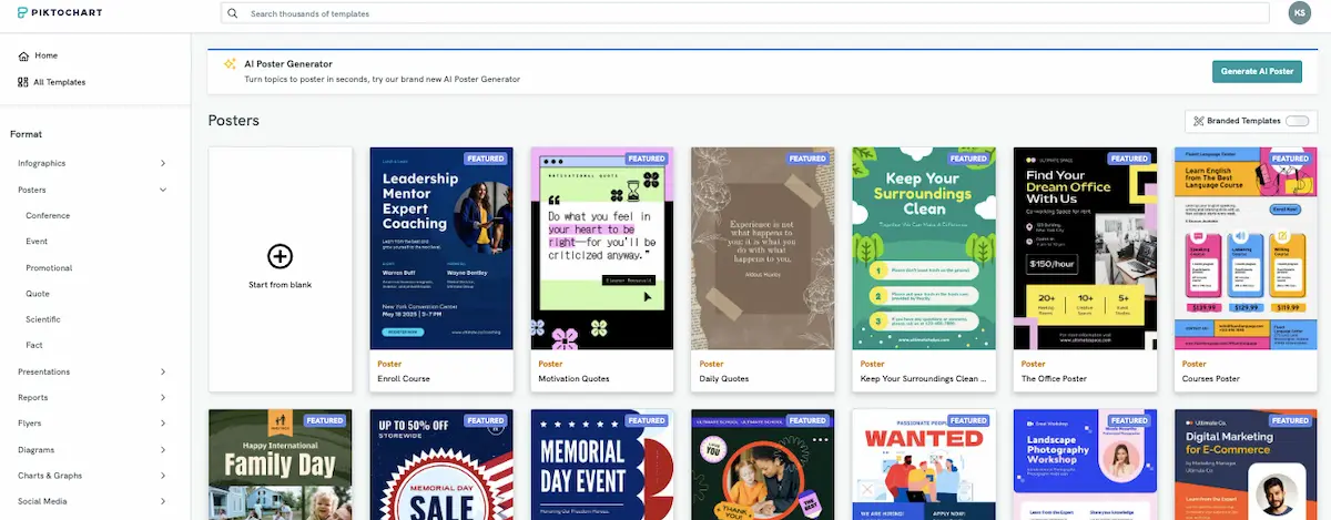 This takes you to our gallery of poster templates. Each poster is fully customizable, so you can change the colors, text, graphics, and layout until you have a design that fits your unique needs.