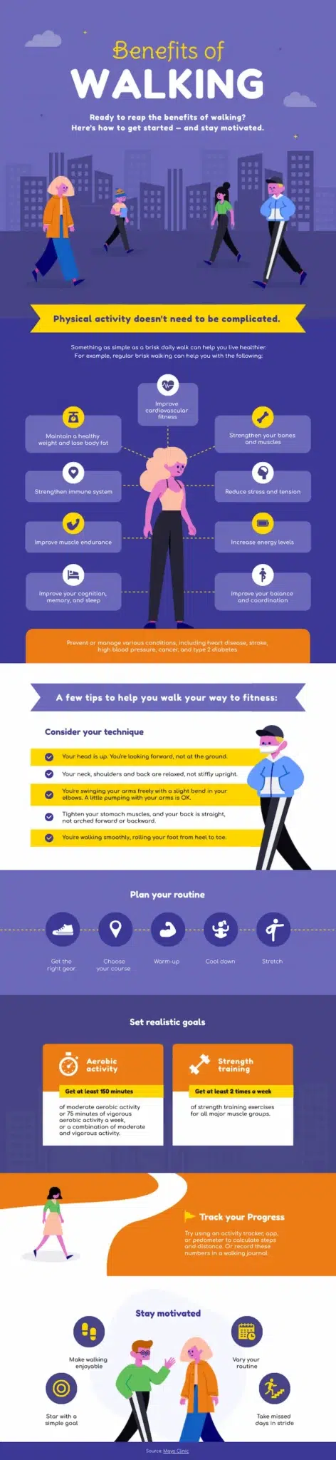 Have a lot of health information to share? This benefits of walking infographic template shows how to use various graphics—icons, illustrations, and text blocks—without creating visual chaos.