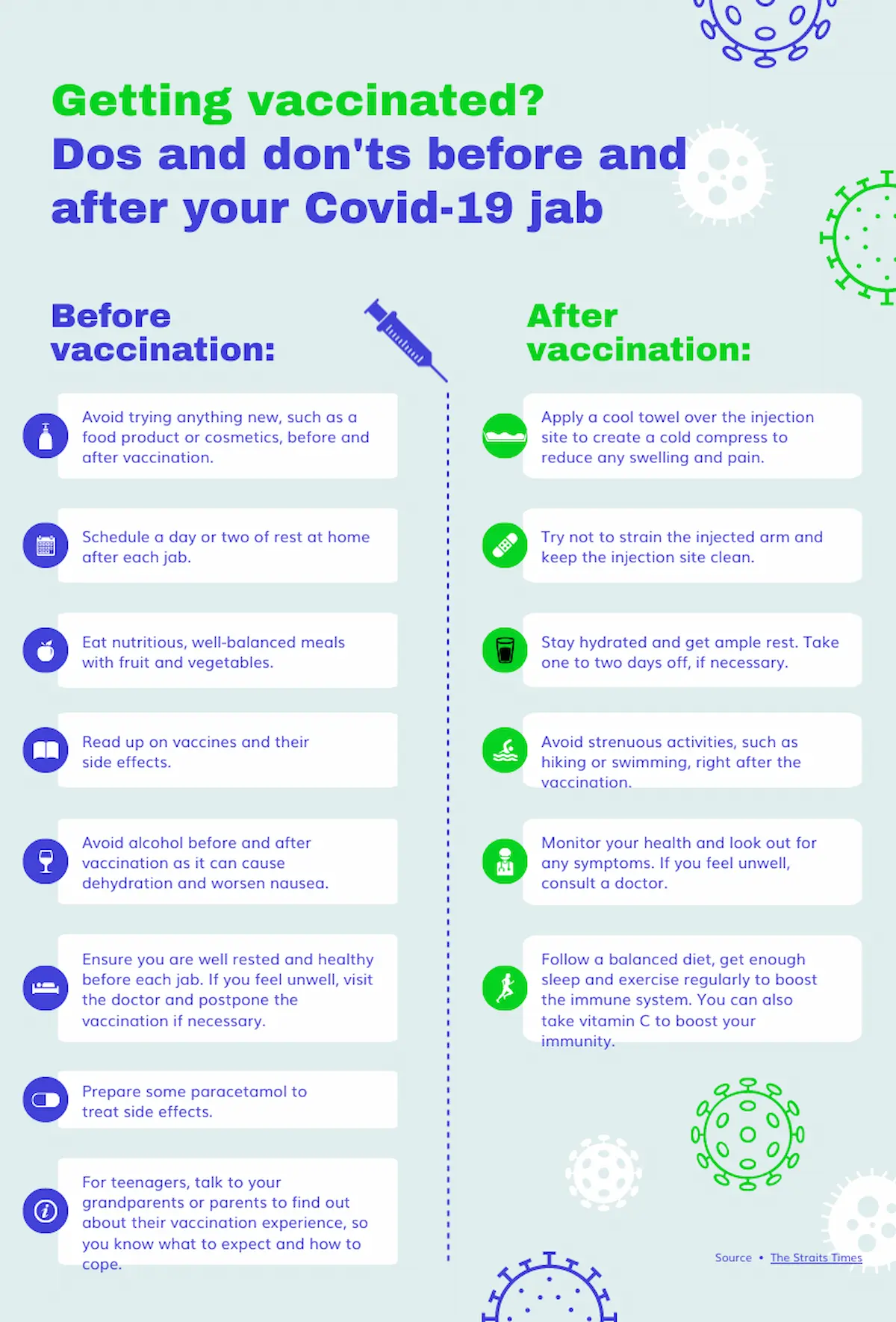 The contrasting blue and green in this vaccination poster create clear visual categories. You can use the split design for topics like safe partying guidelines or healthy dorm room habits.