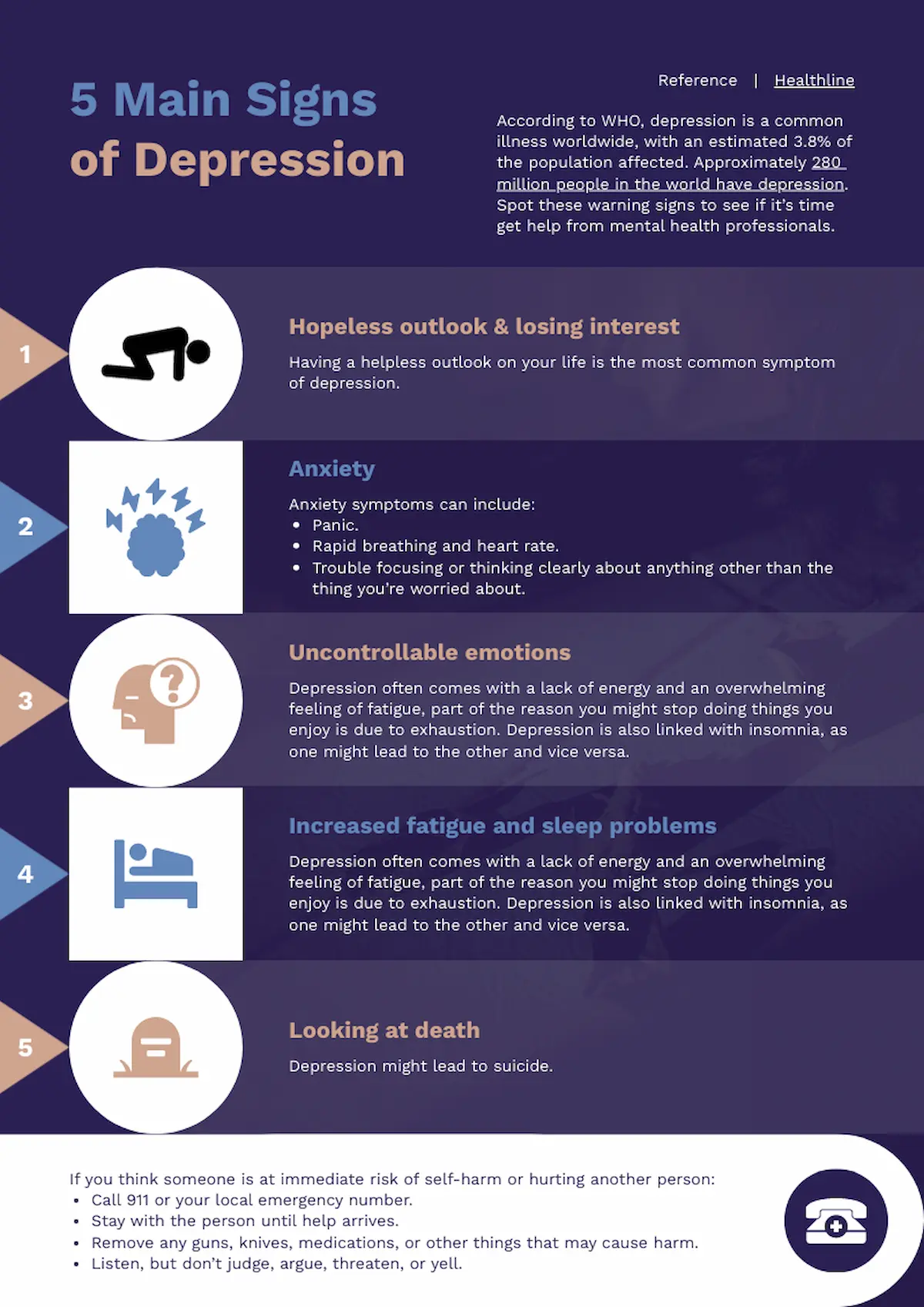 This poster on the signs of depression works because it uses recognizable icons to illustrate common signs of depression, making complex emotional symptoms easy to recognize. The clean layout prevents information overload.