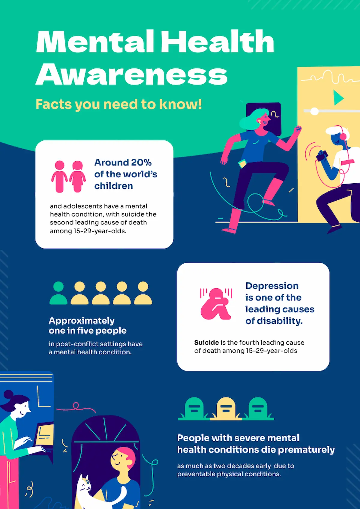 Bright colors in this mental health awareness poster make it hard to ignore— which is the point. The bold design is perfect for areas that see a lot of traffic.
