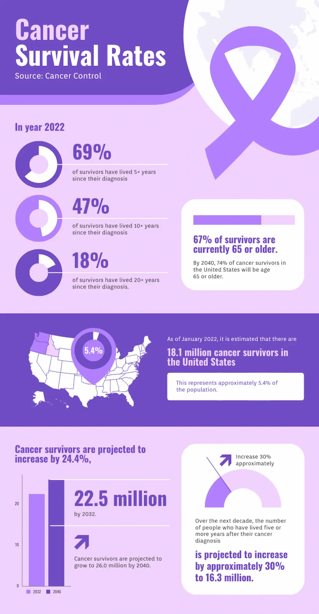 A variety of charts and graphs highlight the key points in this poster and emphasize positive news that readers might otherwise fail to notice. Multiple shades of purple tie in perfectly to the theme of cancer awareness.