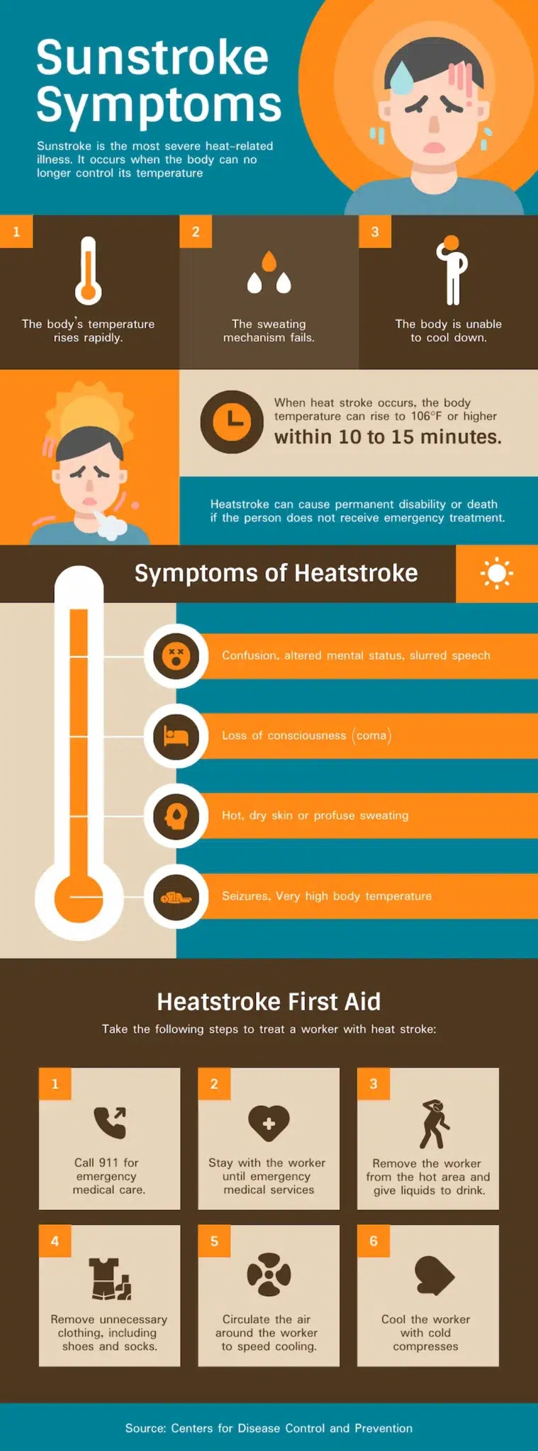 While this template focuses on sunstroke symptoms in workers, its design makes it ideal to present any emergency-focused health data. Clear icons and simple language communicate the message effectively so that even in a moment of crisis, someone reading the poster can understand what steps they need to take.