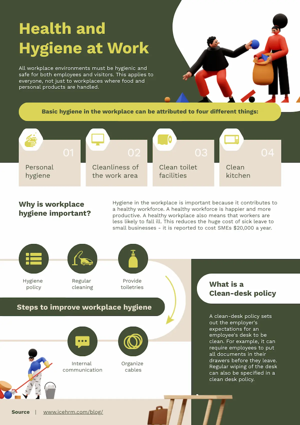 The calm colors in this workplace health and hygiene poster appeal to an adult audience and maintain a professional feeling. Using a few small images prevents visual fatigue from too much text.