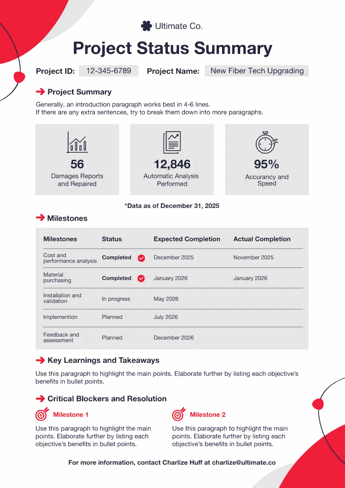 This project progress template is a great example of a team report. Key achievements get the headline treatment, followed by a review of the project timeline and next steps in the sequence. As a result, teams see exactly what’s done and what’s blocking progress.
