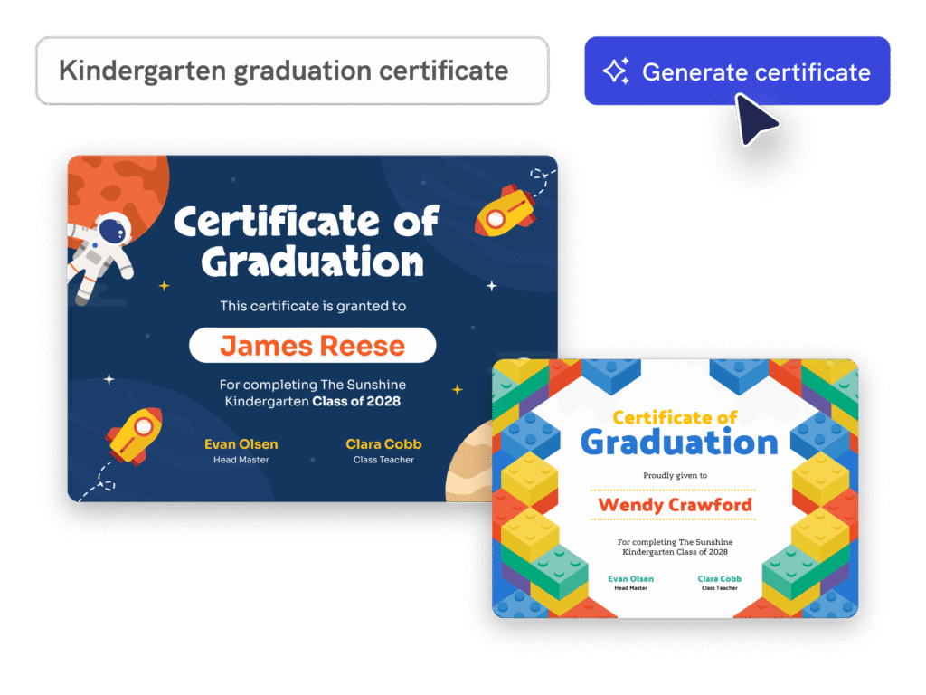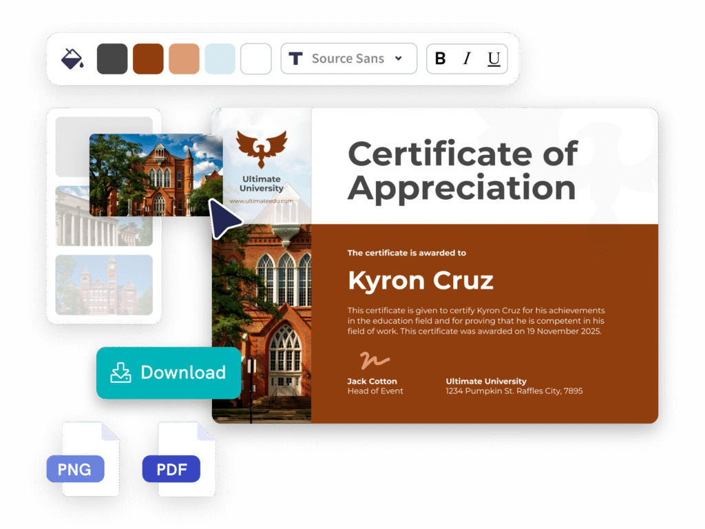 - Instantly generate a beautiful certificate that you can further customize with fonts, colors, logos, or backgrounds.