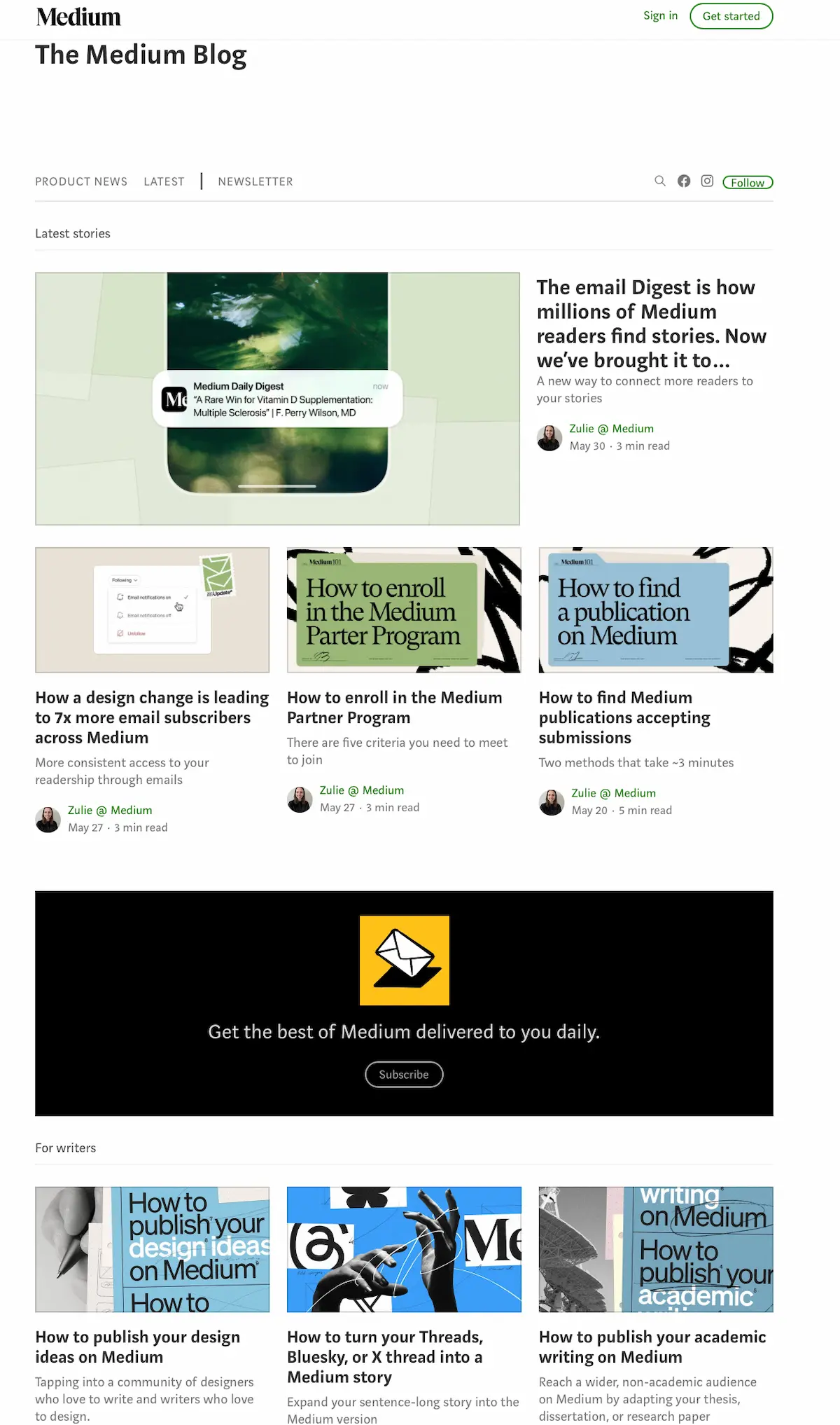 Medium.com achieves unity through consistent typography, strategic white space, aligned grid systems, and a minimal color palette that creates a seamless reading experience.