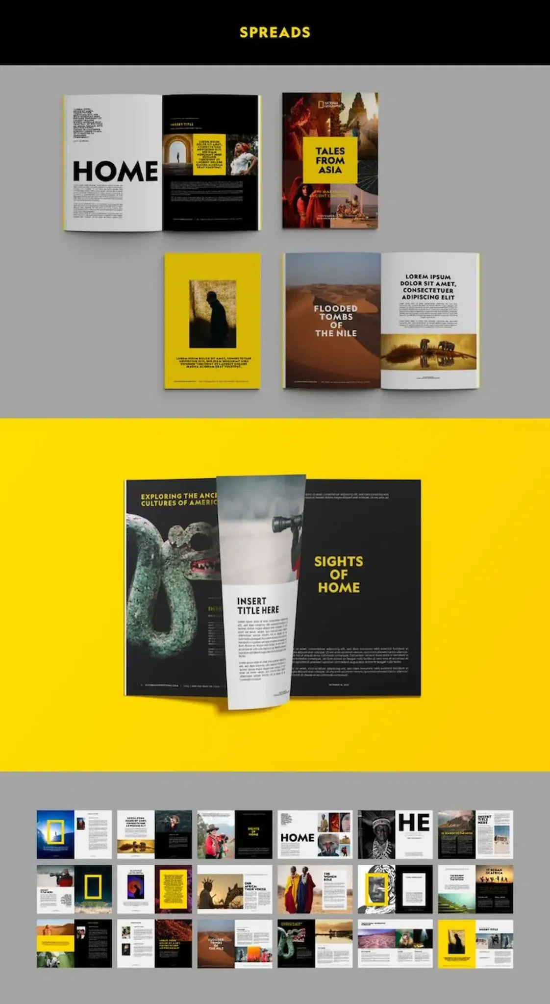 National Geographic exemplifies conceptual unity where every element reinforces exploration and discovery through their iconic yellow border frame, documentary photography style, and educational, authoritative tone.