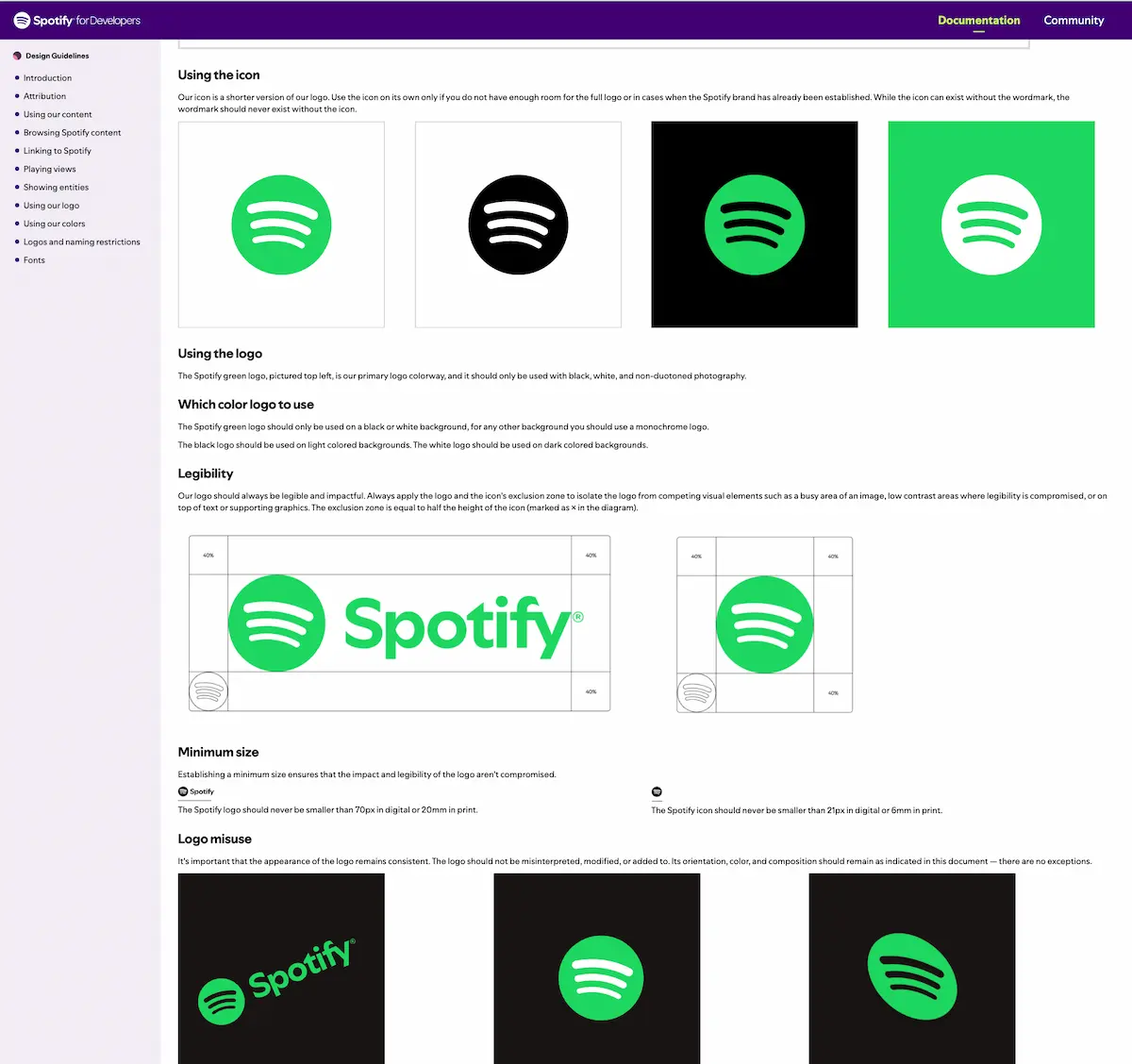 Spotify’s design and branding guidelines demonstrate this with their consistent green accent color, rounded corners on all images, unified typography system, and consistent spacing between elements.