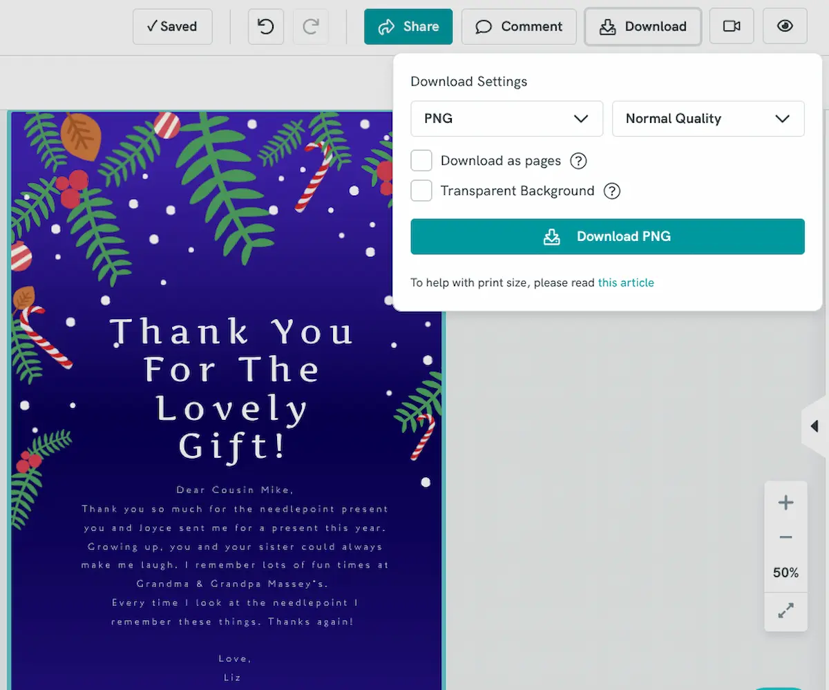 Once you’re ready to send, press the “download” button at the upper right of the workspace and select file quality appropriate for sharing in an email, posting on social media, or printing and mailing.