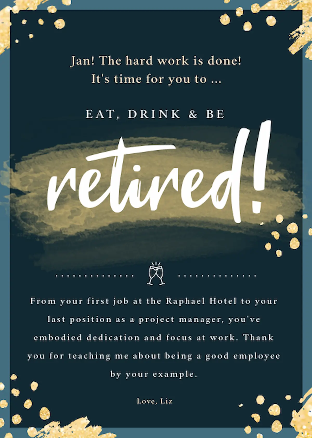 On the other hand, my sister, who recently retired, enjoys cards that both make her laugh and are a little bit classy. So I adapted a retirement party invitation to tell her thank you for being a wonderful role model as a hard worker.