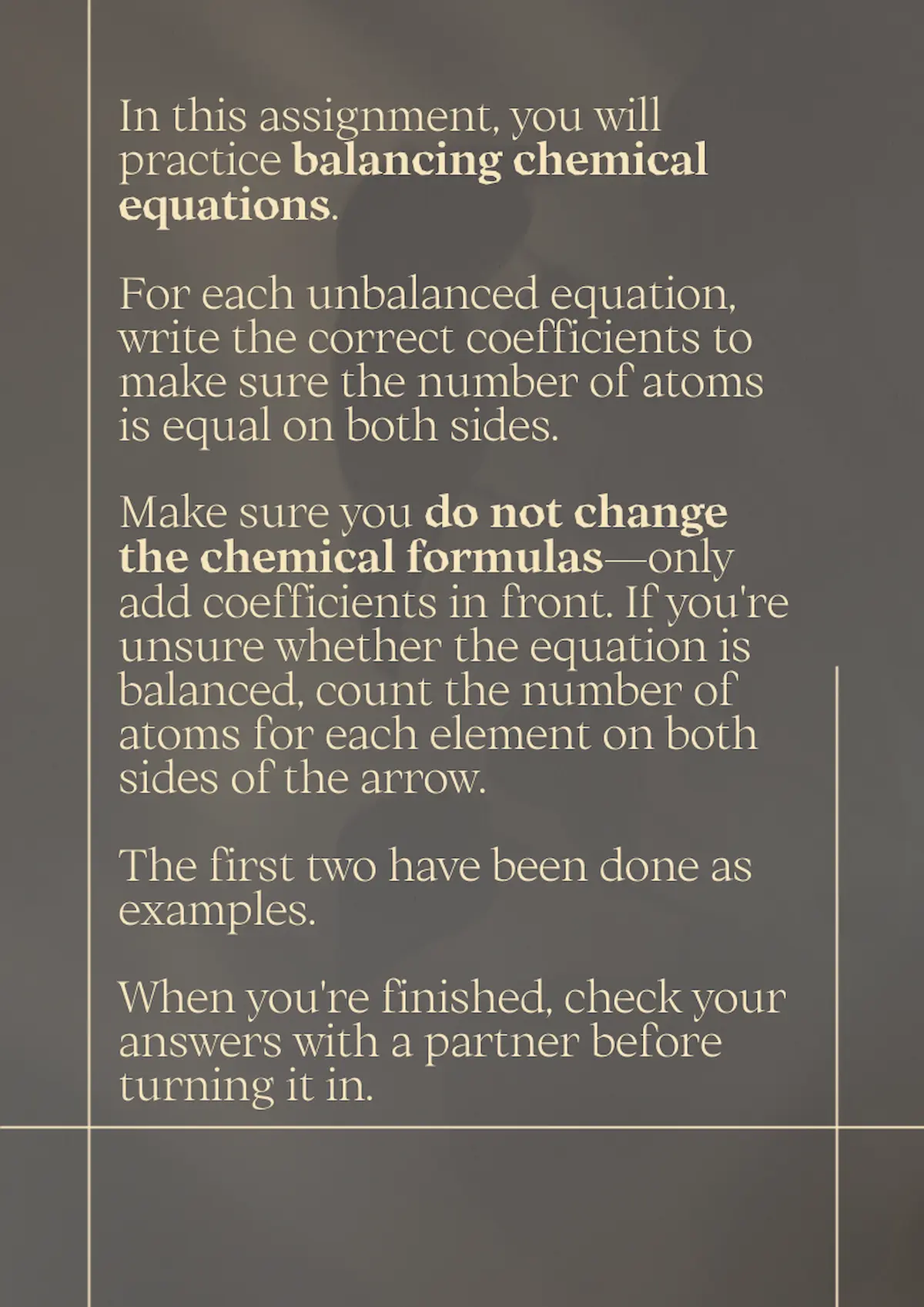 To ensure your instructions are understandable, include formatting such as bolding key directions and numbering each step clearly. If your worksheet includes multiple types of practice (like fill-in-the-blank questions and a writing prompt) begin each section with instructions instead of lumping them together at the top.