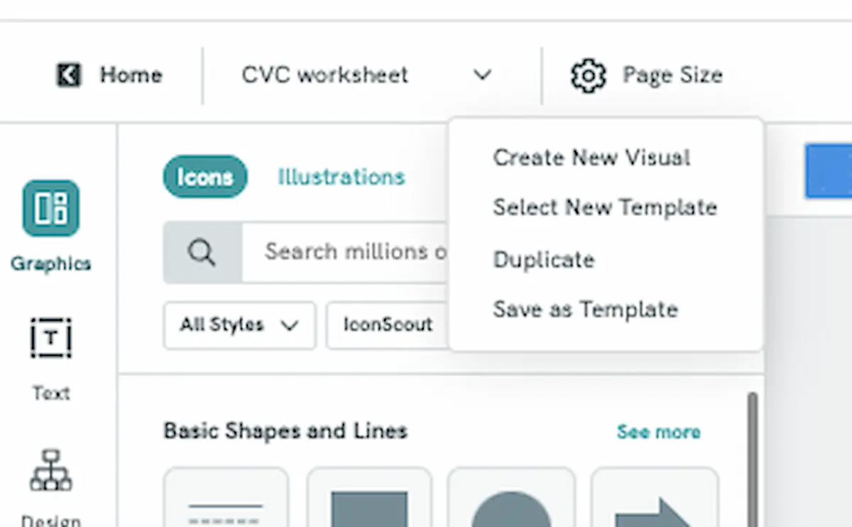 To reuse the same format with different content, select the arrow to the right of the title you gave your worksheet and choose Duplicate. We suggest using this option instead of continuously editing your original, in case you need to access the original to assign makeup work or teach the same lesson during the next school year.