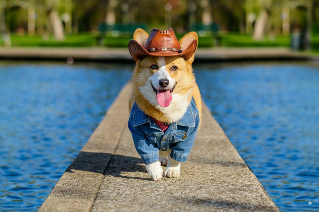 User prompt: Give the Corgi a cowboy hat and jacket
